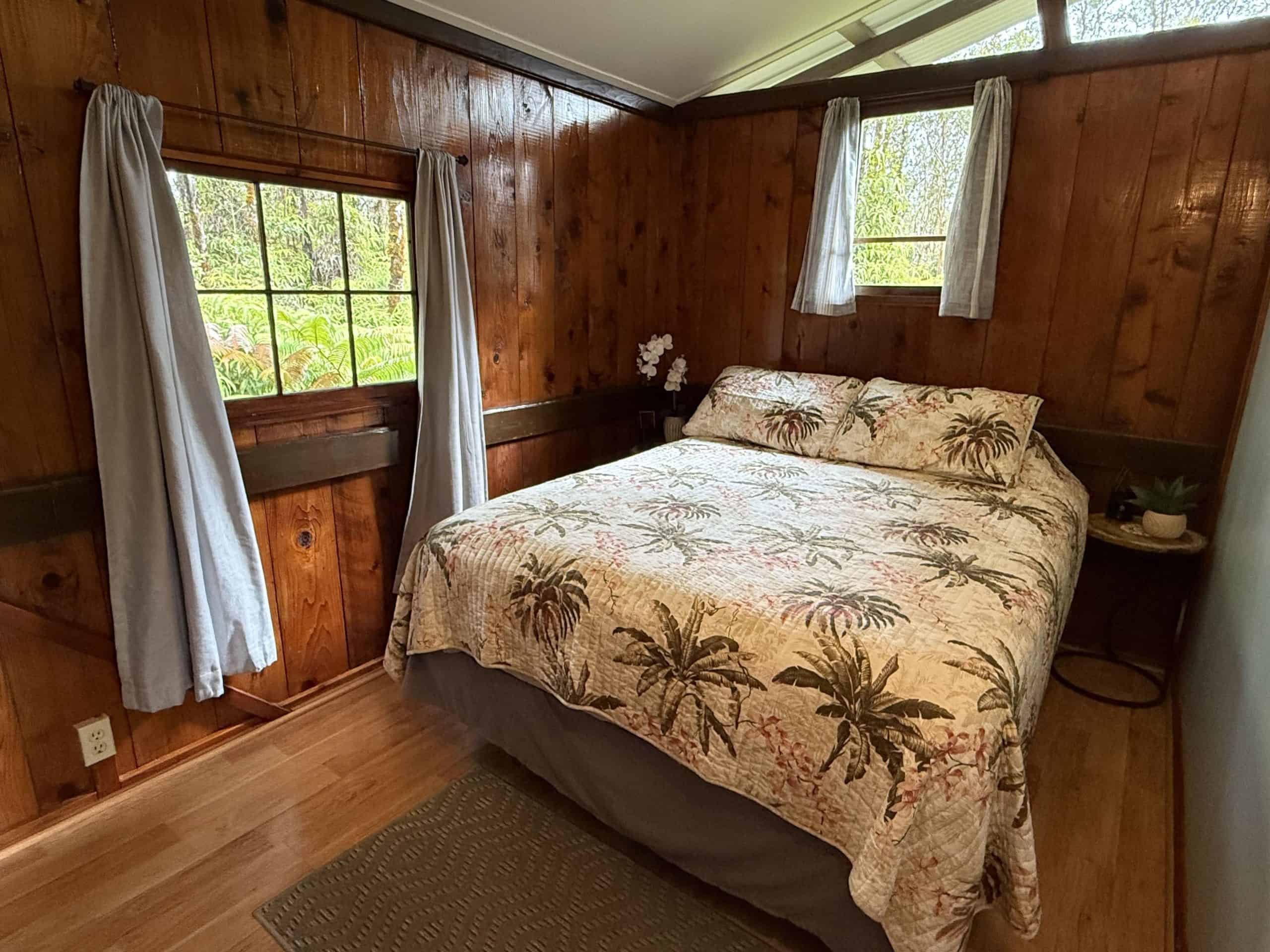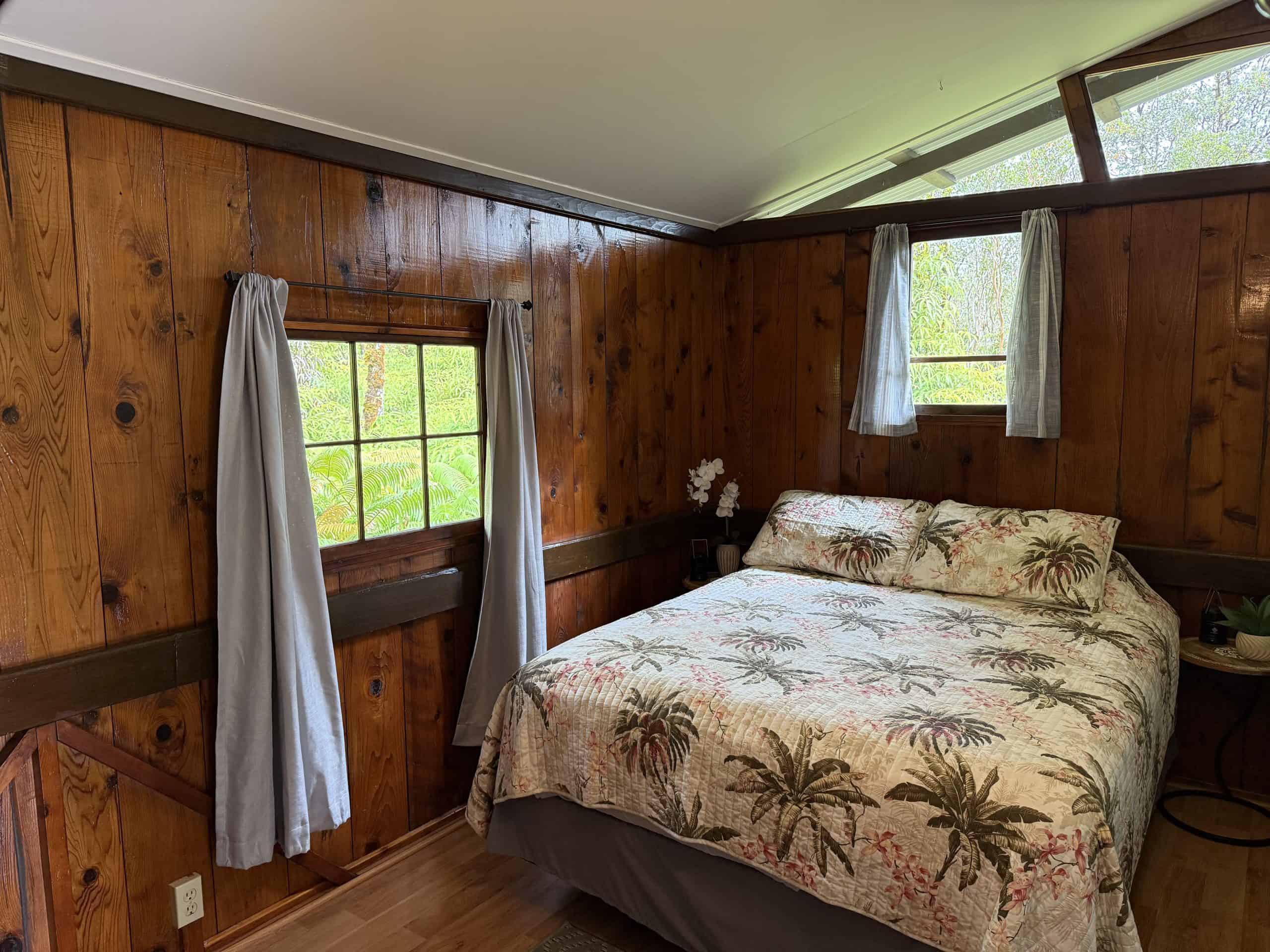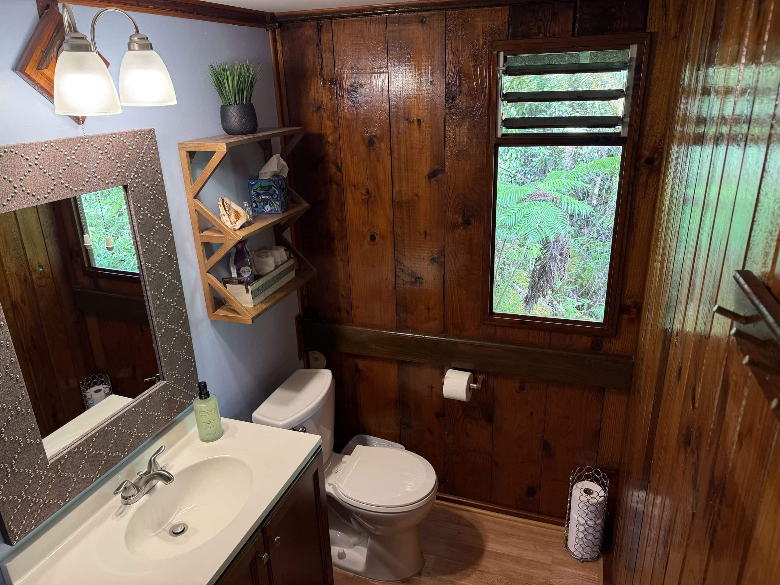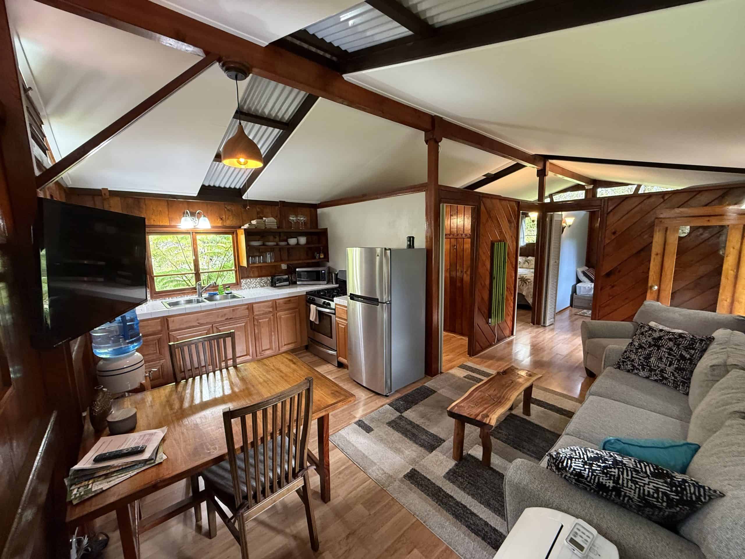 This peaceful rainforest cabin offers a comfortable and private retreat with modern amenities. Located at a 560 square feet elevation, it stays cool most of the time, but a portable A/C and dehumidifier are provided for warmer days. The “treehouse”-style cabin is accessed via one flight of stairs and features a spacious bedroom with a queen bed, and a second small bedroom (80 sf) is perfect for extra guests or spreading out suitcases or clothes, etc. There are two half bathrooms, a powder room upstairs and a shower room downstairs. You’ll love the fully-equipped kitchen with its view into the forest.