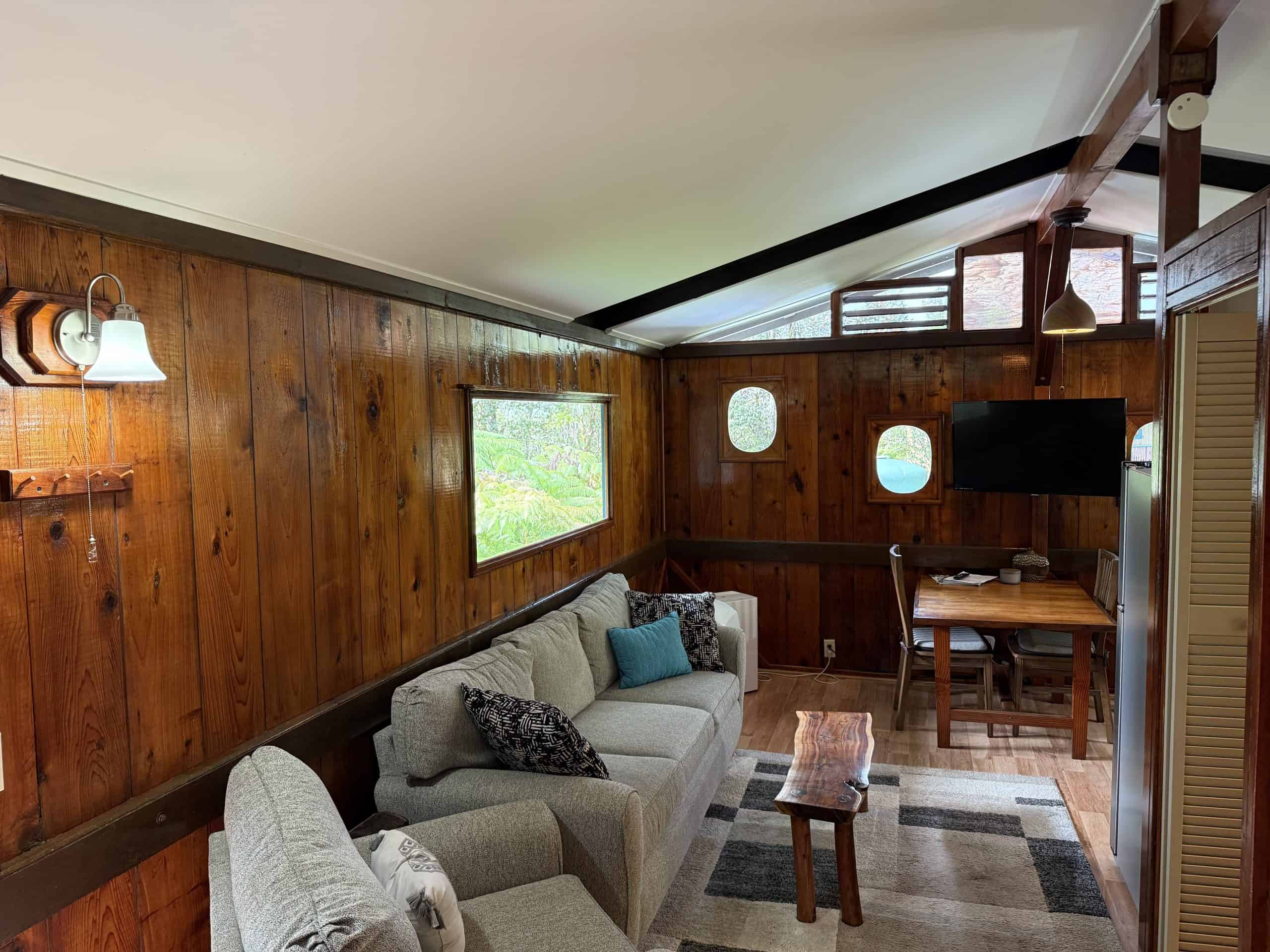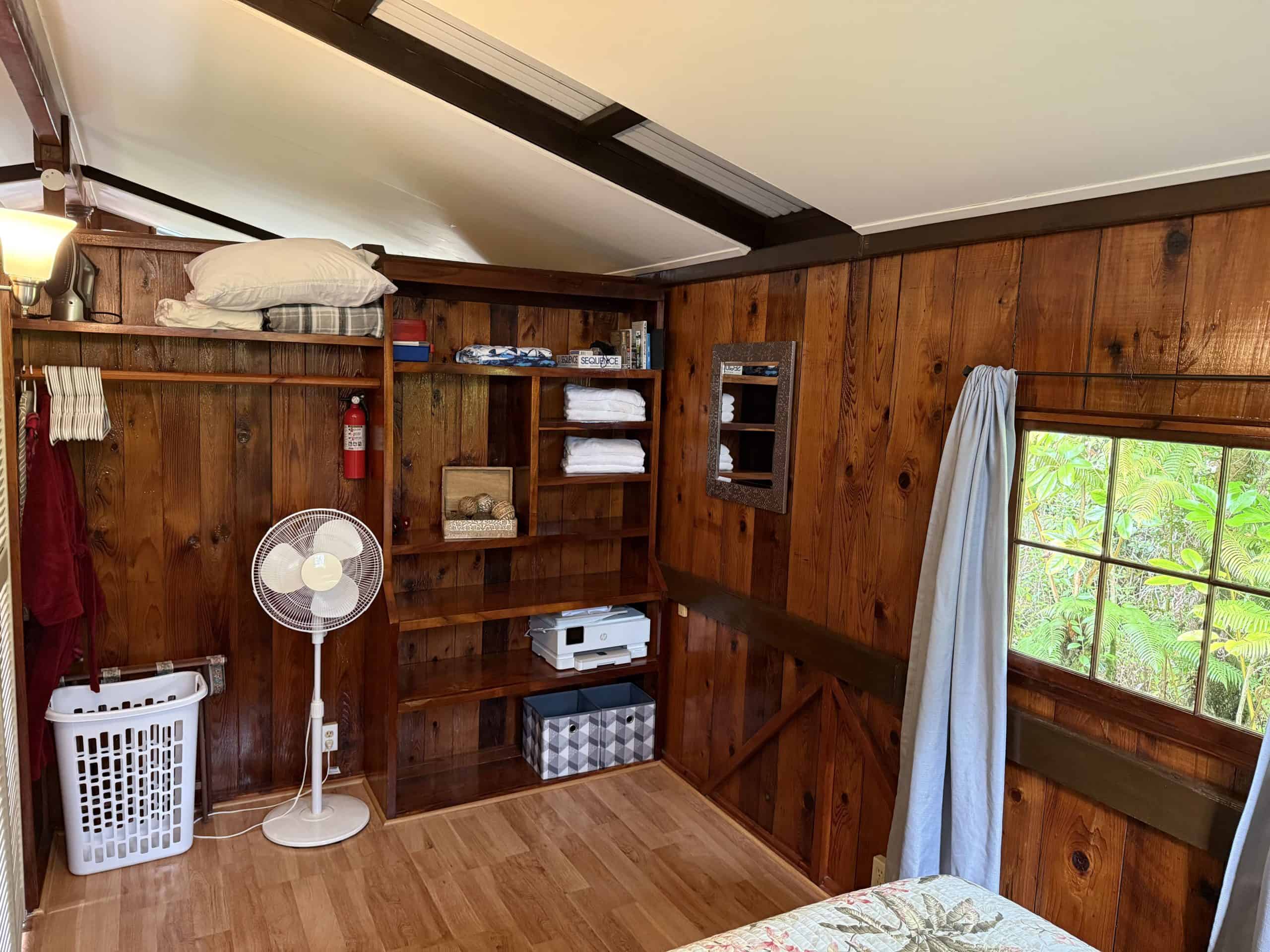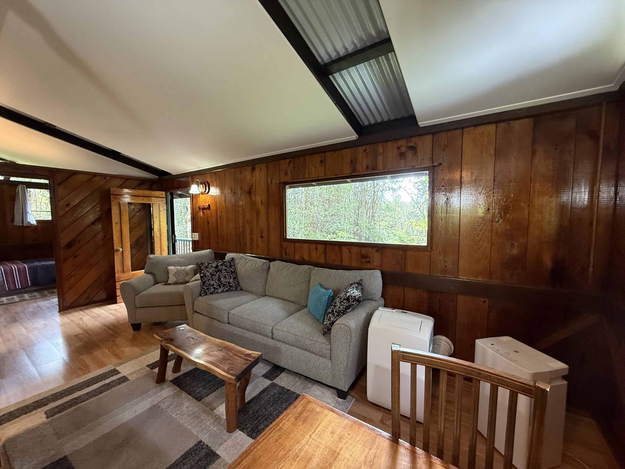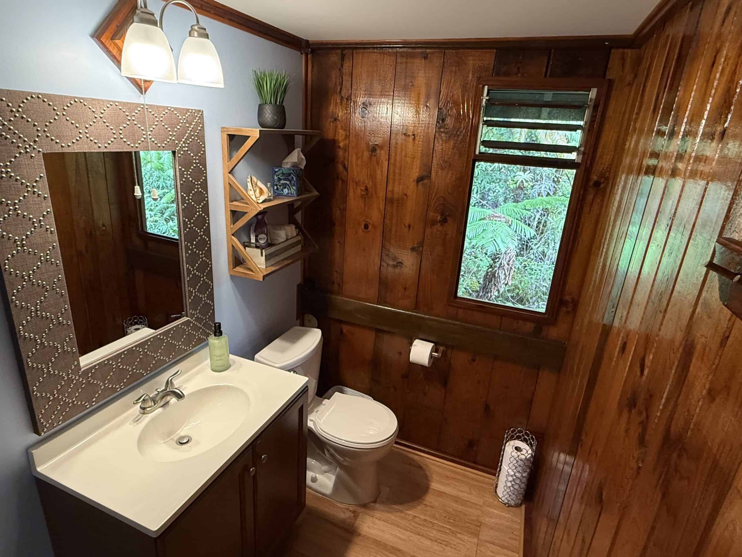 This peaceful rainforest cabin offers a comfortable and private retreat with modern amenities. Located at a 560 square feet elevation, it stays cool most of the time, but a portable A/C and dehumidifier are provided for warmer days. The “treehouse”-style cabin is accessed via one flight of stairs and features a spacious bedroom with a queen bed, and a second small bedroom (80 sf) is perfect for extra guests or spreading out suitcases or clothes, etc. There are two half bathrooms, a powder room upstairs and a shower room downstairs. You’ll love the fully-equipped kitchen with its view into the forest.