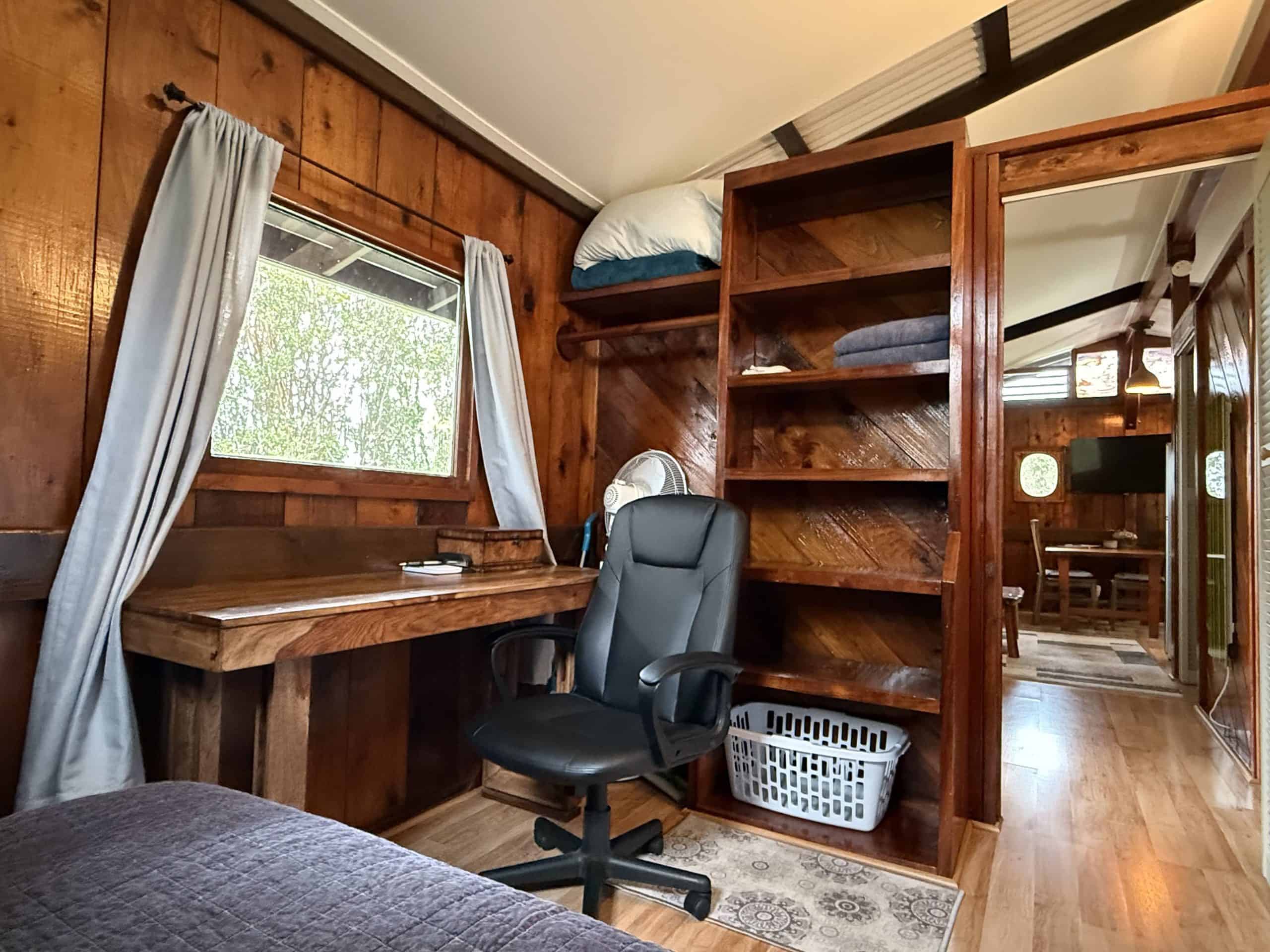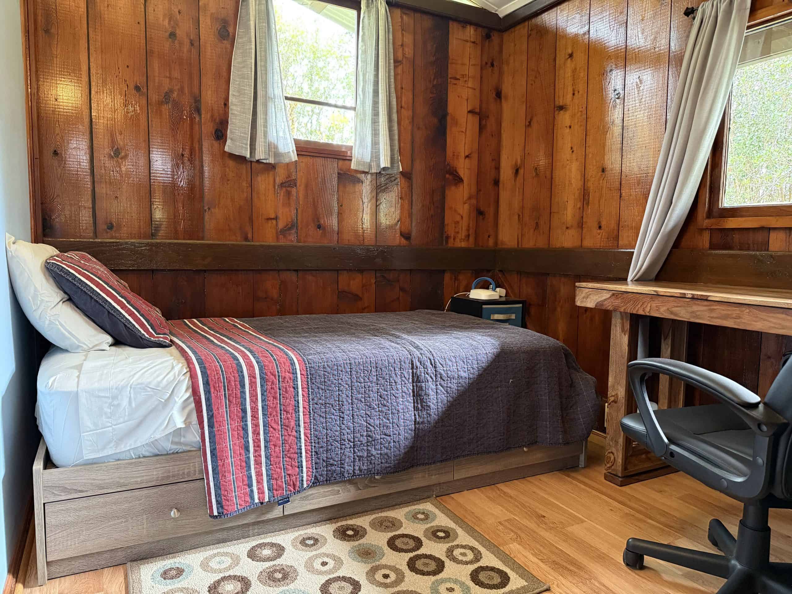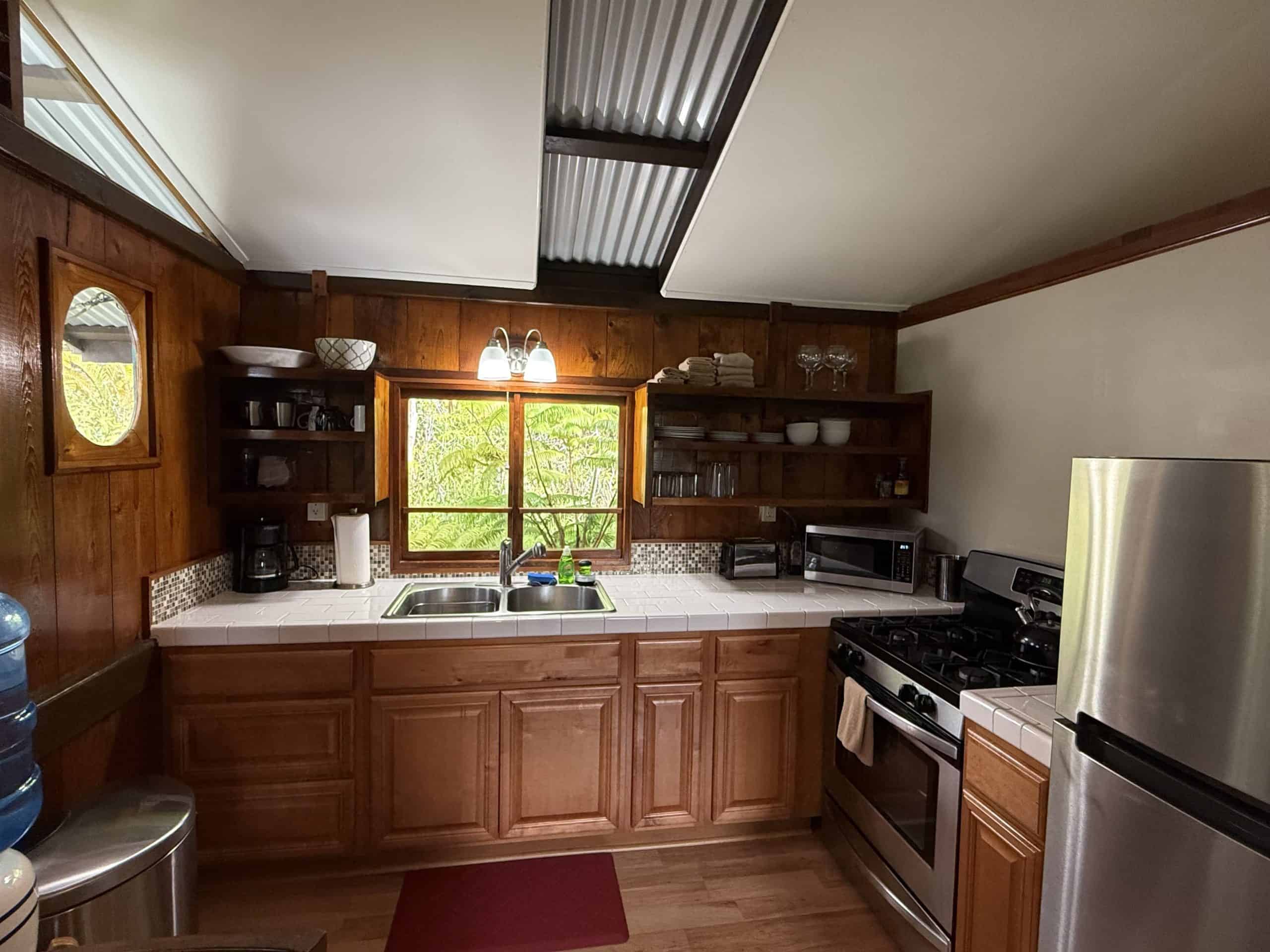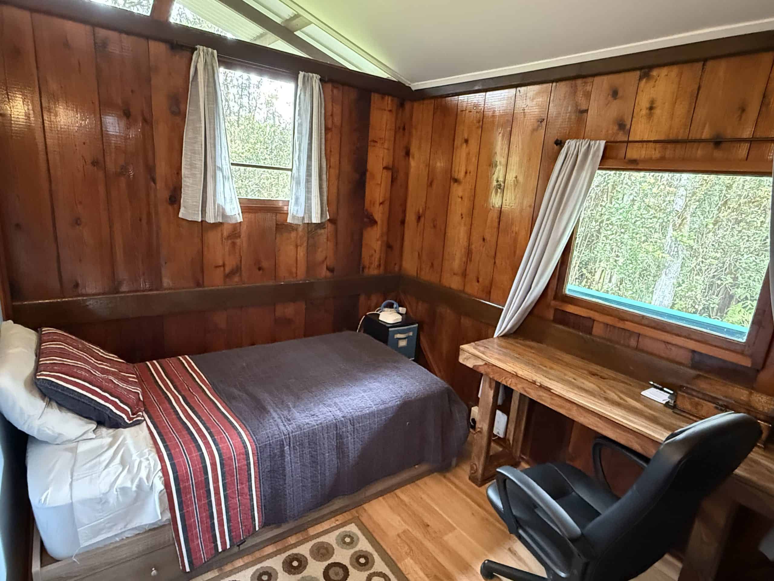 This peaceful rainforest cabin offers a comfortable and private retreat with modern amenities. Located at a 560 square feet elevation, it stays cool most of the time, but a portable A/C and dehumidifier are provided for warmer days. The “treehouse”-style cabin is accessed via one flight of stairs and features a spacious bedroom with a queen bed, and a second small bedroom (80 sf) is perfect for extra guests or spreading out suitcases or clothes, etc. There are two half bathrooms, a powder room upstairs and a shower room downstairs. You’ll love the fully-equipped kitchen with its view into the forest.